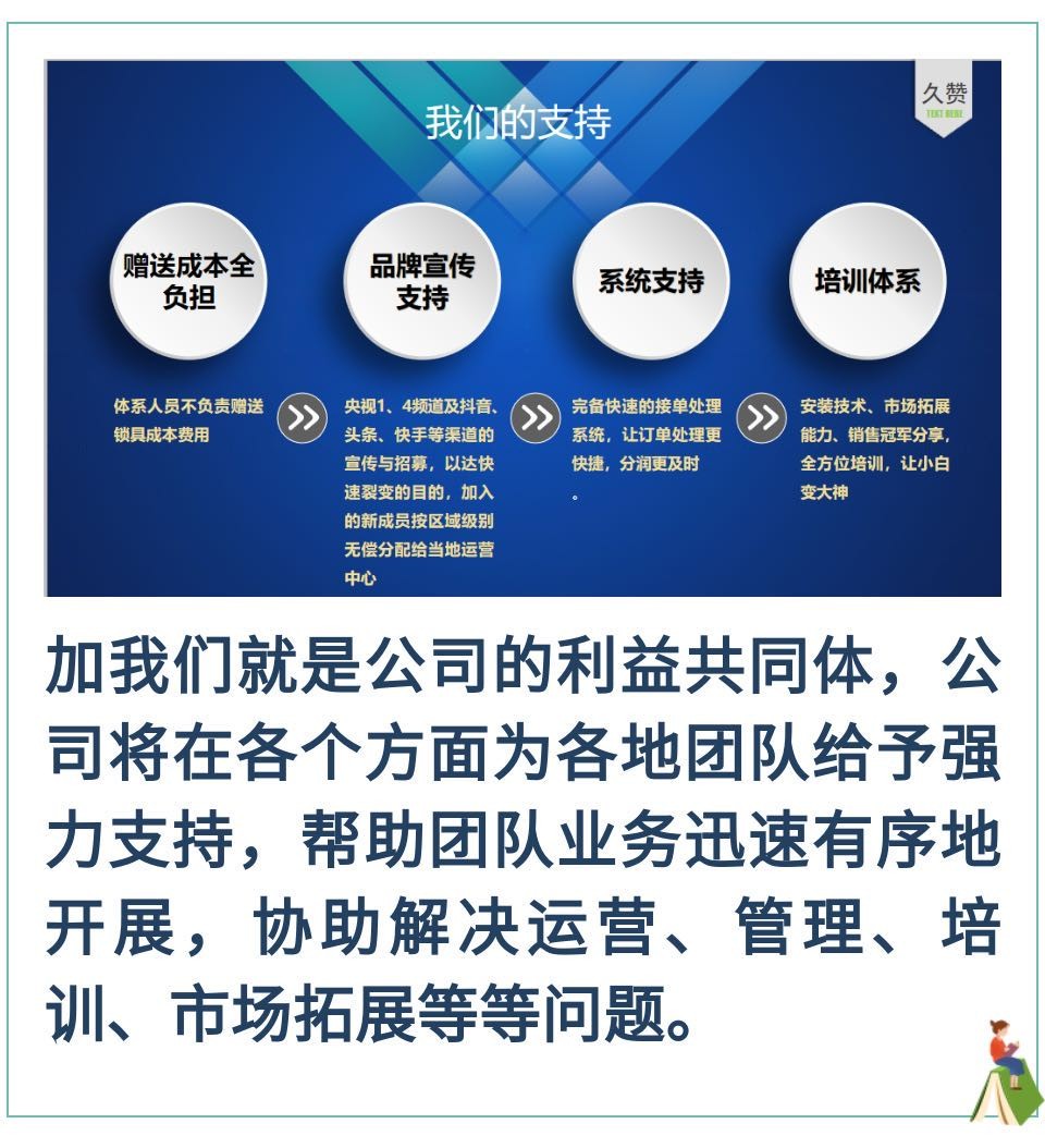 只需1699元购买一把久赞品牌智能锁(央视推广展播品牌),让您与家人提前享受安全与便捷的同时,可获得公司“高级合伙人”资格,高级合伙人享有参与市场推广的代理权,同时享有公司分配利润奖金的权利。